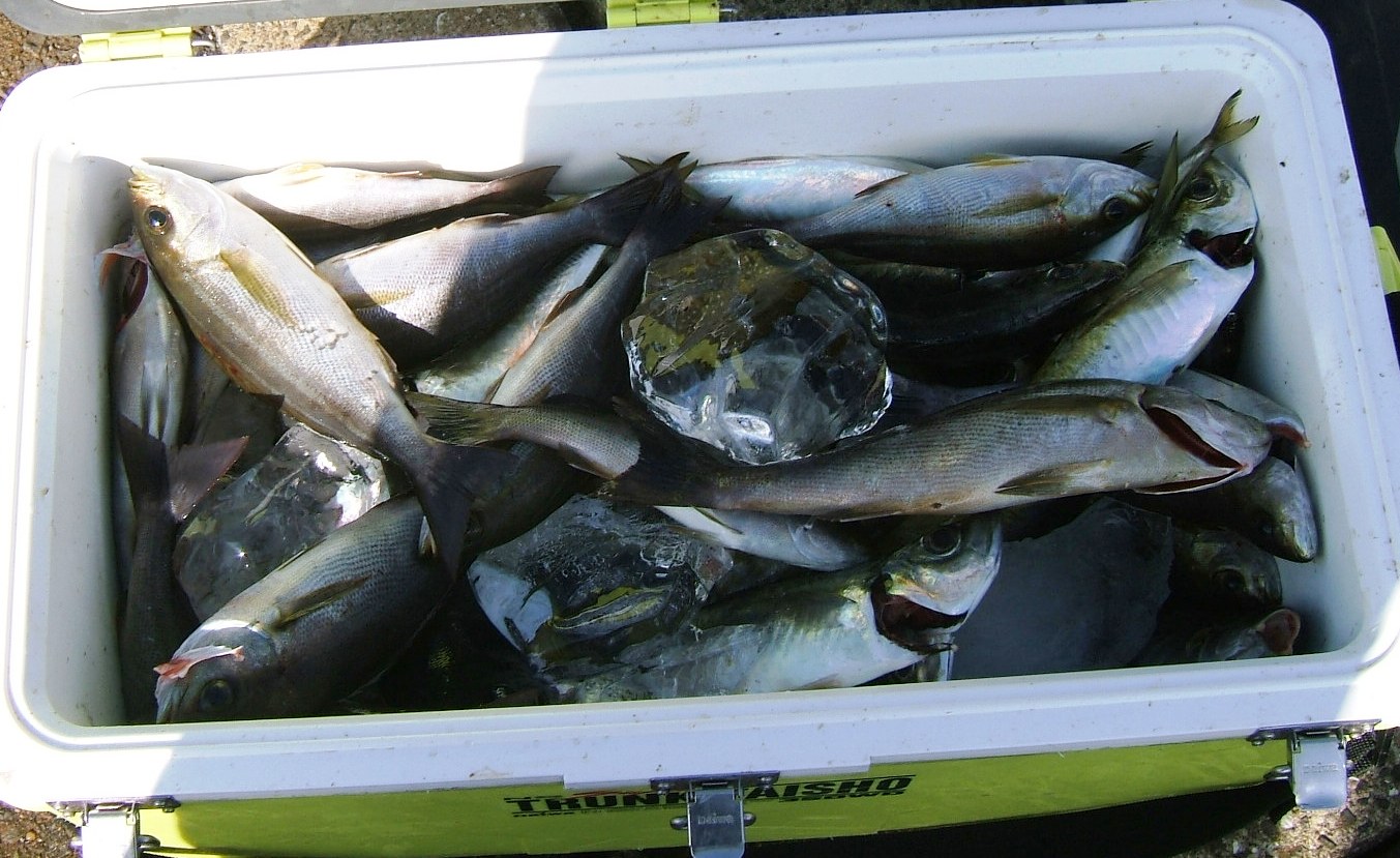 フカセ釣りで真アジ2,5〜3,5cmクーラー満杯。ミズイカも釣る |