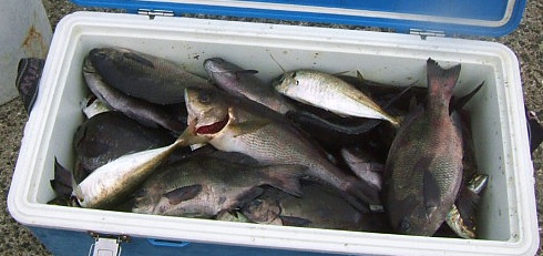 チヌをクーラー満杯。55cmオーバーのチヌがよく釣れてます。 |