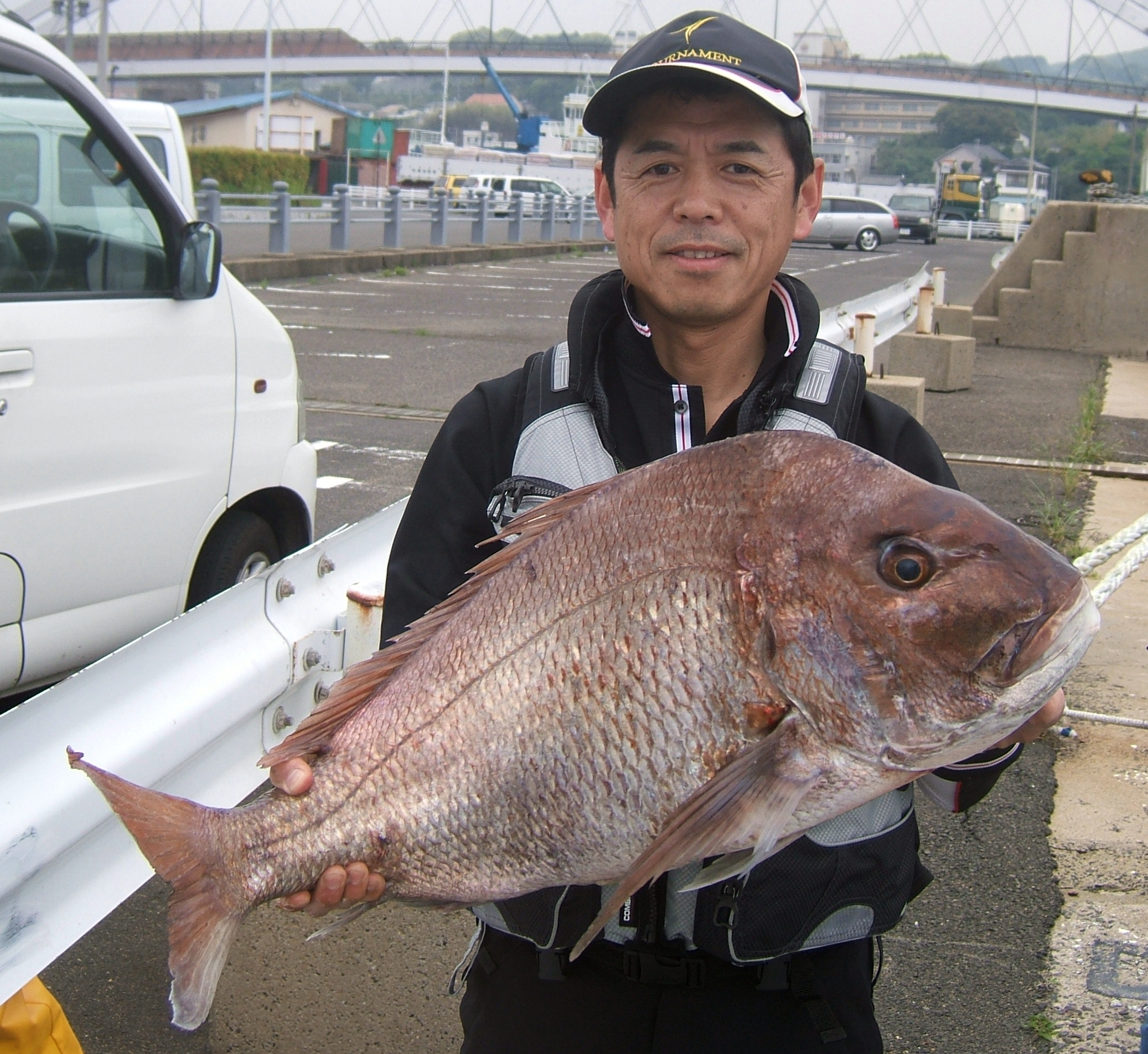 真鯛7,6kg84センチ、チヌも釣る。フカセ釣り、ハリス2,5号。古賀のお父さんガンバリましたね。 |