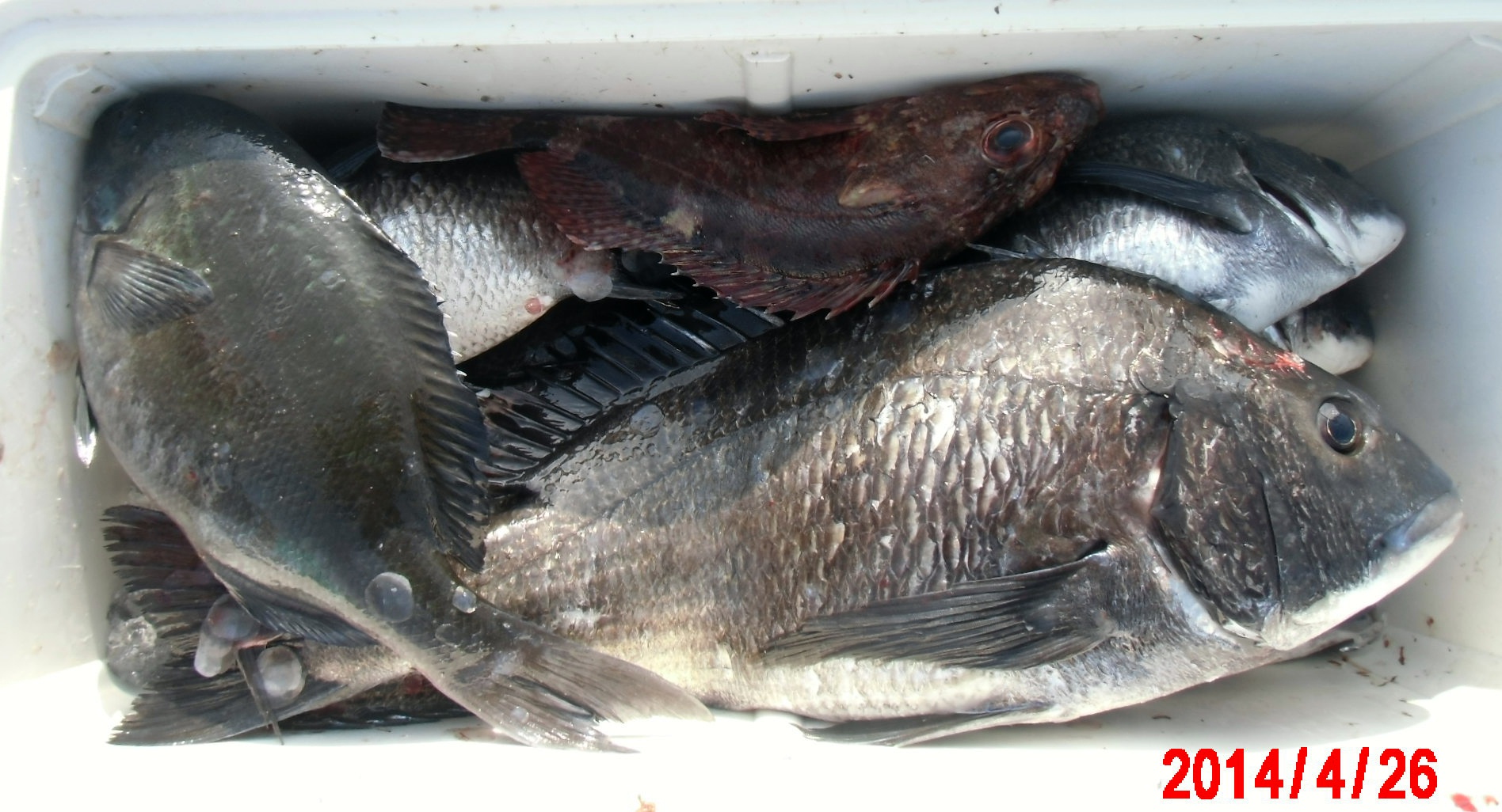 クロ1,4kg、44pを頭に数十枚釣る。クロも釣れ出しました。 |