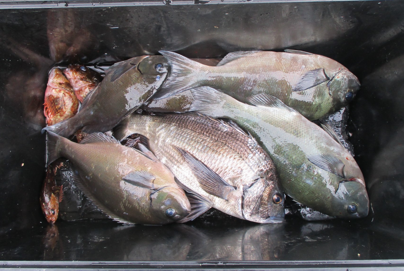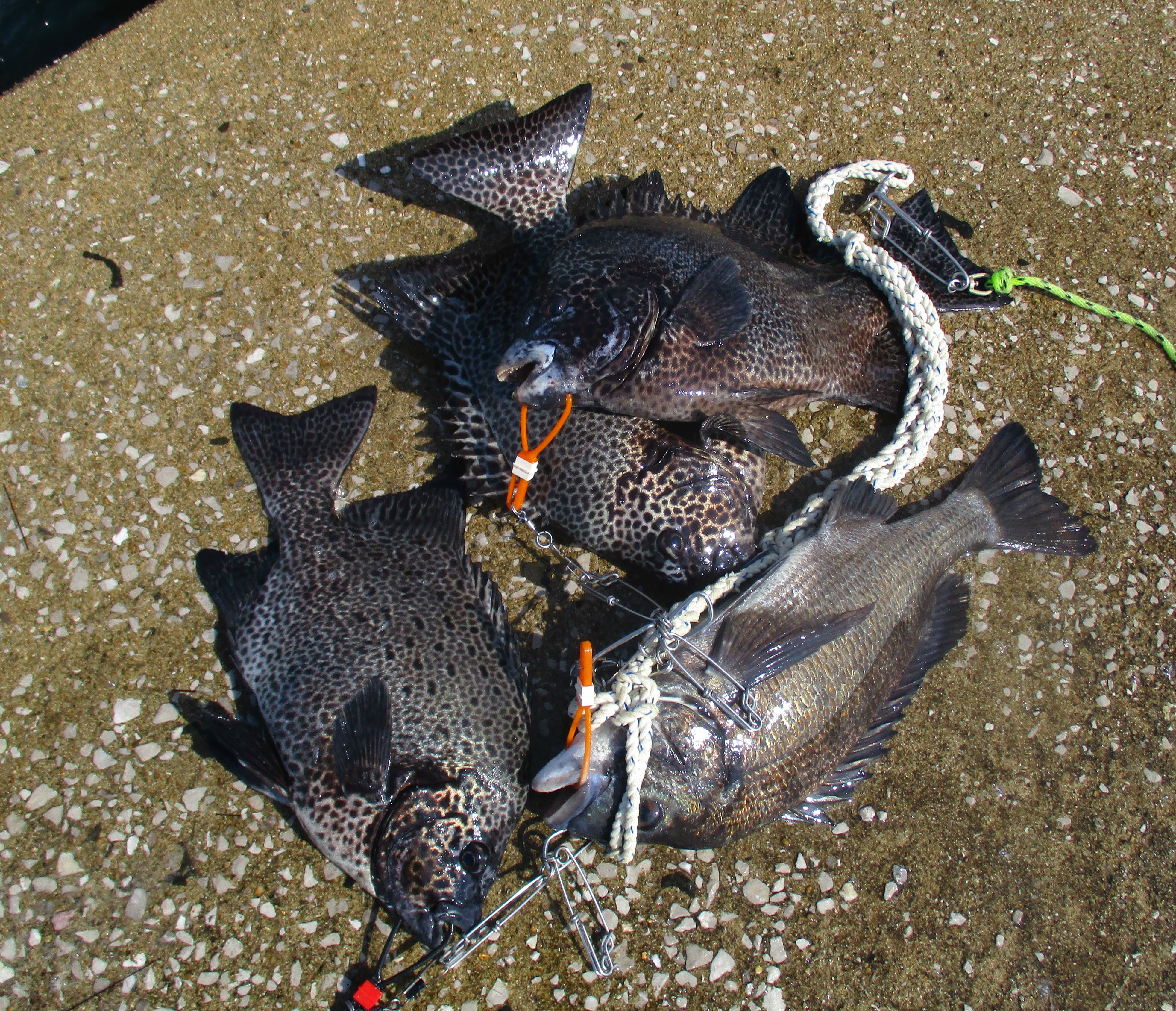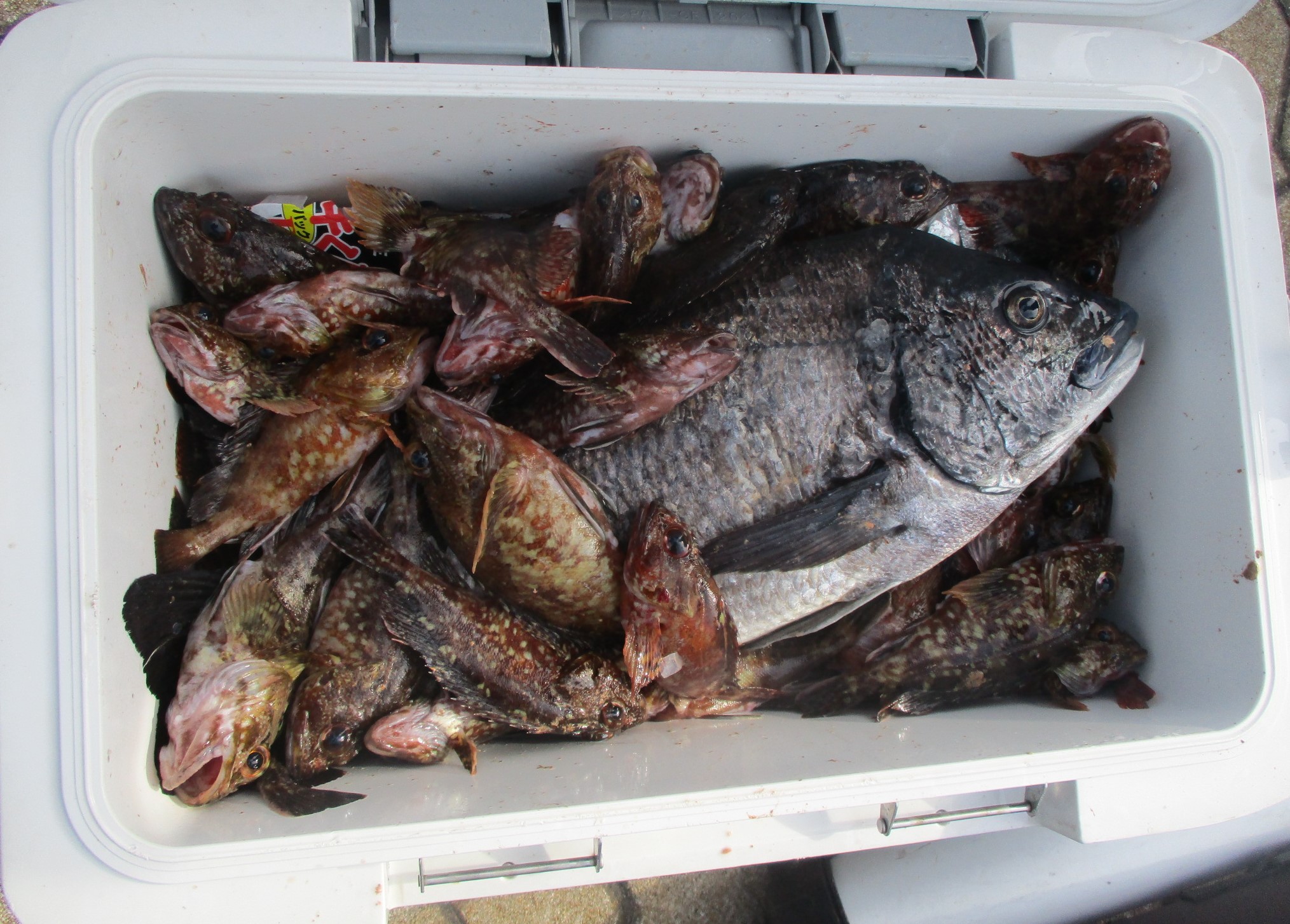 沖防の釣果です!真鯛にクロ、良型でしたよ!アラカブも大漁でした! |